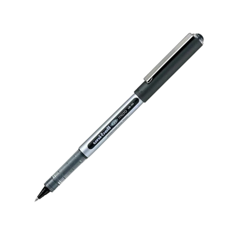 Caneta Uni Ball Eye Micro com ponta de aço tungstênio que permite uma escrita rápida e menor atrito sobre o papel.