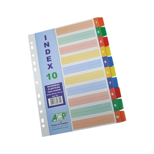 • Separador plástico para fichário. • Universitário com 10 divisões. • Cores sortidas. • Ref. 755 • Dimensões: 224 mm x 295 mm