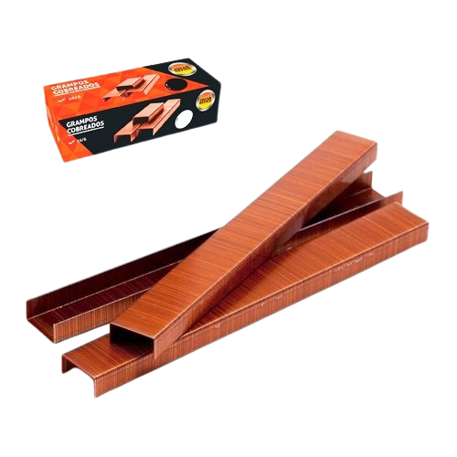 Grampo p/ Grampeador 26/6 Cobreados Cx c/1000 unds • Cor: Cobreado • Marca: Jocar • Peso: 0,020 g • Tamanho: 5,5 x 3,5 cm