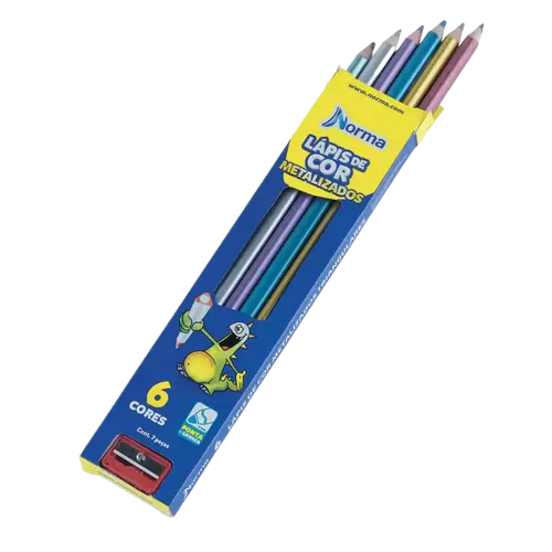 Lápis de Cor Norma Metalizado com 6 cores, feito com madeira de reflorestamento, possui pontas macias que deslizam ao colorir.