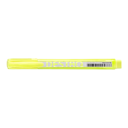 Destaq é um marca texto com ponta chanfrada que possui tinta forte e brilhante que fixa no papel por muito mais tempo.