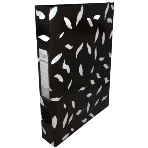 Registrador AZ Oficio Frama , feito em papel cartão de 2mm com forro em papel monolúcido 75g plastificado. Mecanismo todo niquelado com olhal e compressor em plástico. Cor: Preta Tigrada Lombada estreita Dimensões: Altura: 34cm Largura: 28cm Lombada: 6cm