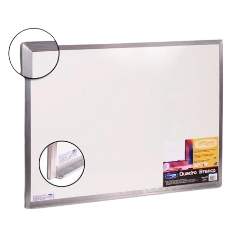 Quadro Branco com moldura de alumínio, para escrita com marcador especial para quadro branco. Trata-se de um quadro econômico, indicado para salas de aula e salas de reunião