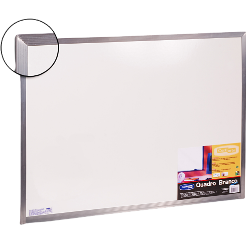 Quadro Branco, para escrita com marcador especial para quadro branco. Apagável a seco com flanela macia ou apagador com base em feltro. fabricado com matéria prima adequada a proporcionar um quadro econômico. Indicado para uso de baixo tráfego.