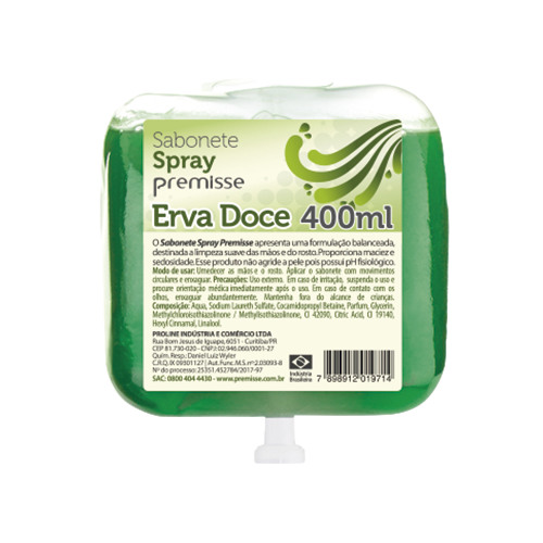 Sabonete Spray Erva Doce apresenta uma formulação balanceada, destinada a limpeza suave das mãos e do rosto. Proporciona maciez e sedosidade. Esse produto não agride a pele pois possui pH fisiológico.