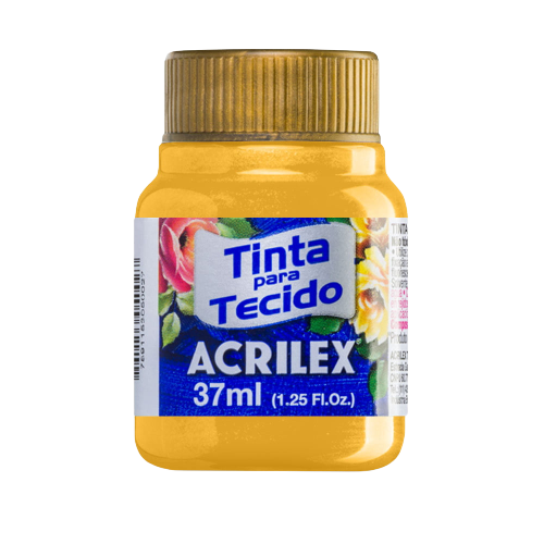 - Tinta para Tecido Amarelo Metálico 37ml Acrilex feita a base de resina acrílica, solúvel em água e não tóxica.